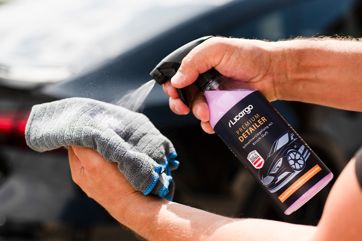 Aufsprühen – Den Detailer dünn auf eine saubere Teilfläche sprühen und sofort mit einem Mikrofasertuch gleichmäßig verteilen. Hinweis: Nicht antrocknen lassen – Abschnitt für Abschnitt arbeiten.